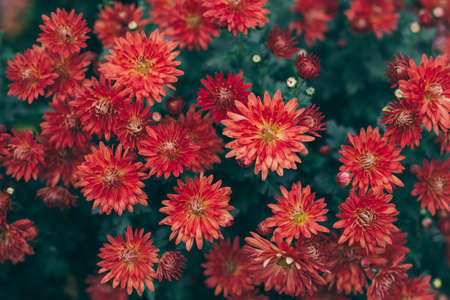 Bright red Chrysanthemums flowers in a autumn garden. Close-up. Selective focus.