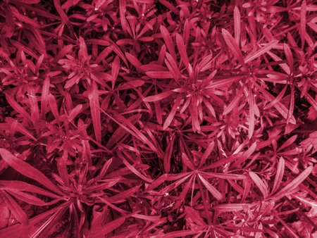 Floral texture of Galium aparine plant tinted with trendy pink Viva Magenta 2023 color. Natural pattern of creeping stalks of catchweed