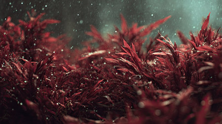 A panoramic wide view of Red algae field growing closely together under light drizzle soft raindrops on leaves ultra realistic photography natural daylight cinematic wide composition lifelike natural scene