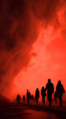 Silhouette of people walking on the road with red sky background