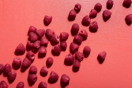 Fresh raspberry pile scattered on a red background. Flat lay of tasty raspberries. Red shades monotone image of berries. Sweet summer fruits.