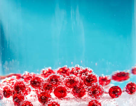 red beads in water with bubbles, Christmas card, abstraction