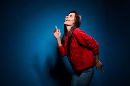 Photo of cheerful positive young lady dance good mood empty space enjoy isolated on gradient blue color background