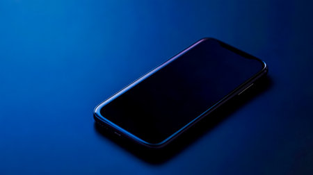 Smartphone with abstract blue light bokeh on black background.