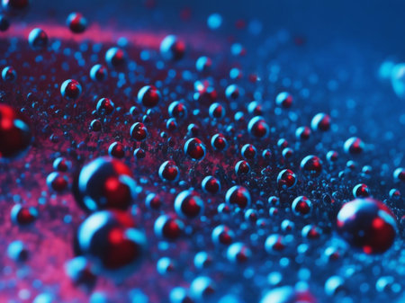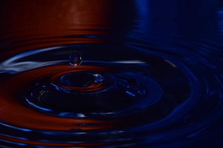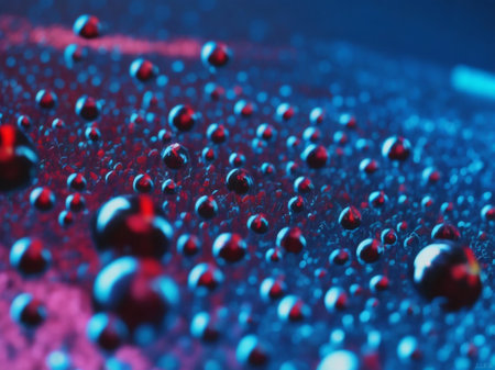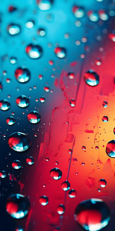Water droplets with red light reflections on dark surface