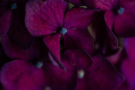 Closeup of purple hyrangea flower with water drops in garden. Macro dark pink hortensia with bokeh background wallpaper. Classy bridal and valentine decor bouquet.