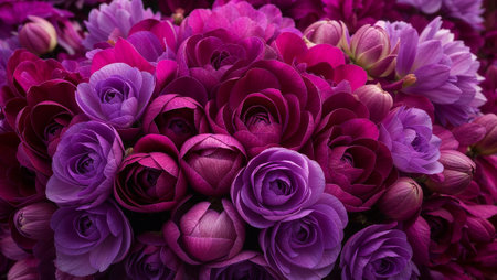 Close up of vibrant purple and magenta ranunculus flowers, creating a captivating floral background. AI generated image