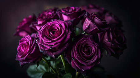 A stunning close-up showcases a beautiful bouquet of deep purple roses, their velvety petals adorned with delicate water droplets. Set against a dark, moody background, the vibrant floral arrangement exudes a romantic and elegant atmosphere. This image, captured in a studio setting, is perfect for Valentine's Day promotions, wedding invitations, or any project seeking a touch of botanical beauty and fresh, blooming flora. Ideal for adding a touch of love and elegance to your designs.