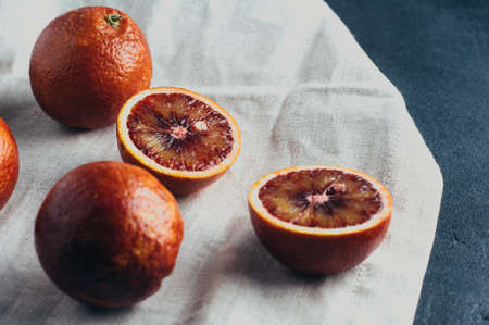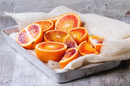 Sliced Sicilian Blood oranges fruits in aluminum tray with white sackcloth over gray wooden background.