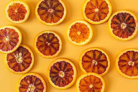 Group of fresh organic Sicilian blood oranges sliced over yellow background. Flat lay, space