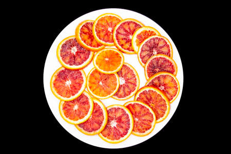 Sicilian sliced ​​orange on a white plate on a dark background. Sliced ripe Sicilian oranges against background. Healthy and tasty red sliced ​​orange.