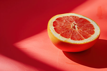 Fresh grapefruit half on a vibrant pink background, showcasing its juicy interior and textured rind, perfect for food photography or summer concepts