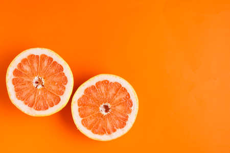 Halves of blood oranges on a orange background, space for text. top view.