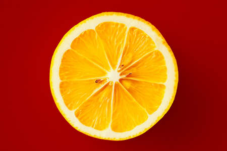 Bright yellow lemon on a red background.
