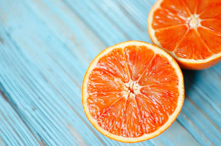 Pieces of blood orange on wooden background.