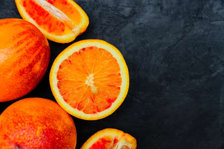 Top view of Sliced and whole ripe juicy Sicilian Blood oranges on black background. Copy space for text