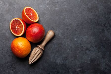 Sicilian Blood juicy oranges and juicer. Top view with copy space