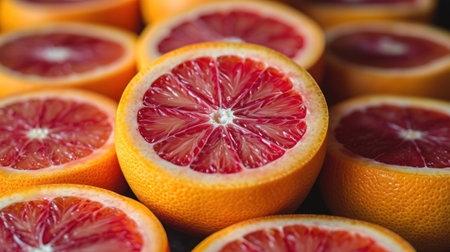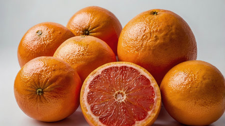 Vibrant blood oranges arranged with one sliced open revealing the inner fruit's rich color, showcased for food or healthy eating concepts.