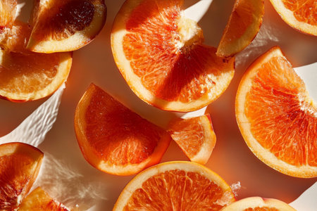 Close-up of sliced citrus fruits, arranged in a colorful pattern.