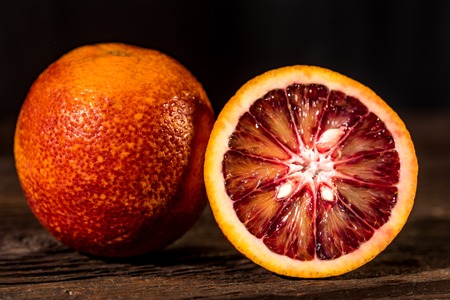 Whole and cut ripe juicy Sicilian Blood oranges