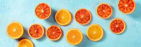 Blood orange fruits composition. Abstract citrus fruit background with copy space for text