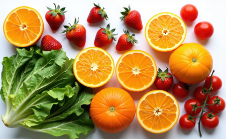 Fresh fruits and vegetables arranged on a clean white background, showcasing healthy food choices and vibrant colors.