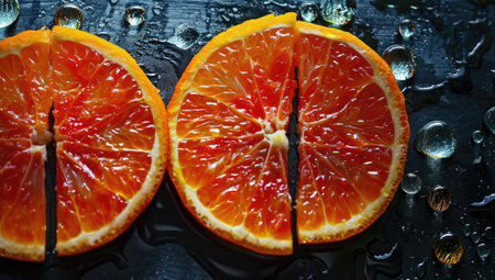 Slices of red orange on a black background with water drops