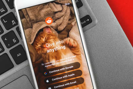 Kharkov, Ukraine - February 22, 2021: Reddit app on the screen Apple smartphone, title page and authorization, social news site photo