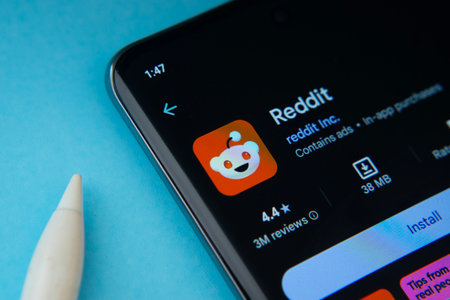 Dhaka, Bangladesh- 30 Oct 2025: Reddit app on a iPad screen with a pen pointing at the install option.