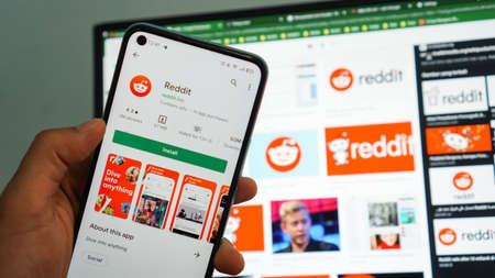 KULIM, MALAYSIA - CIRCA AUGUST, 2021 : A mobile phone with Reddit application on Google Play Store.