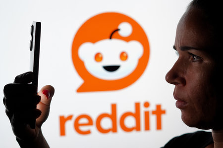 May 15, 2024, Brazil. In this photo illustration, the woman holding a smartphone and the Reddit logo is seen in the background