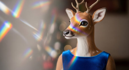 Anthropomorphic deer wearing blue dress with rainbow prism light effect portrait art