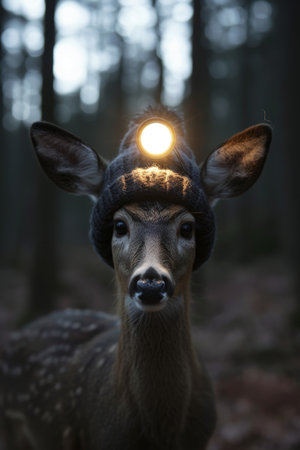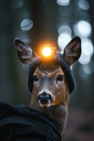 A roe deer with a lantern on its head stands in a dark forest.