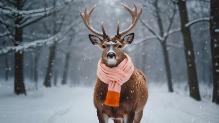 A funny deer dressed in cozy soft pink warm clothes, A deer in a scarf in a winter theme. Seasonal wallpaper.