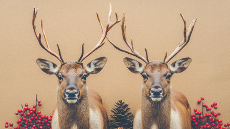 Photo of a pair of reindeer on a brown paper background with Christmas decorations. Web banner with copy space on the right. --chaos 30 --ar 16:9 --v 6.1 Job ID: 5a9b1522-6bbb-49d1-8473-52836c19c780
