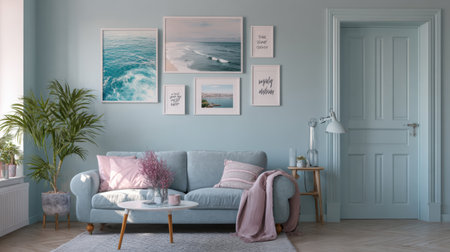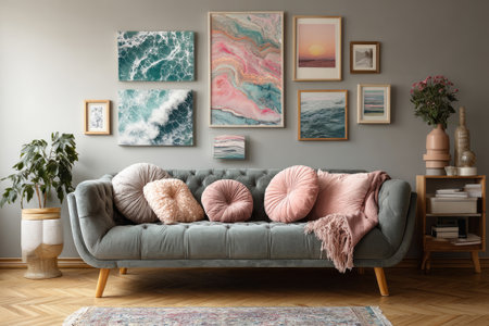 Chic interior with a plush blue sofa and eclectic wall art creating a cozy yet modern living space, Generated AI.