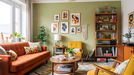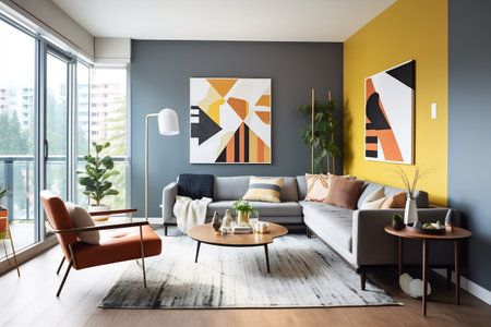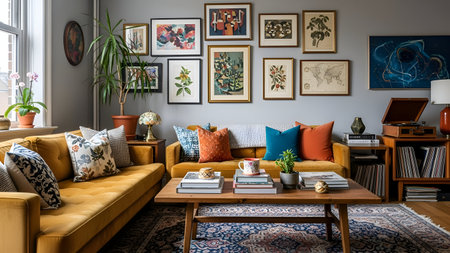 A bright and inviting living room features comfortable sofa adorned with decorative pillows, round coffee table, and lush indoor plants. colorful artwork wall adds vibrant touch to serene atmosphere