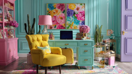 An interior space displays a yellow armchair, centered on a desk with a laptop, and accented with colorful floral artwork. The scene uses bright pastel colors, with a mix of modern and classic decor. This image could be used for various design, lifestyle, or commercial applications.
