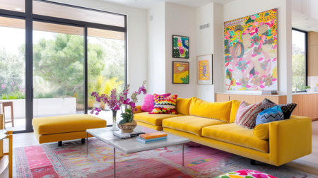 A bright and modern living room featuring a yellow sofa, colorful cushions, and vibrant artwork. This cozy space is filled with natural light and stylish decor.