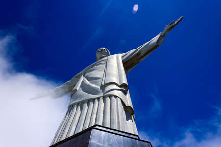 REDEEMER CHRIST, RIO DE JANEIRO, BRAZIL - MARCH 18, 2016: Bottom view of the Christ Redeemer´s Statue. The deep blue sky and a soft cloud behind.