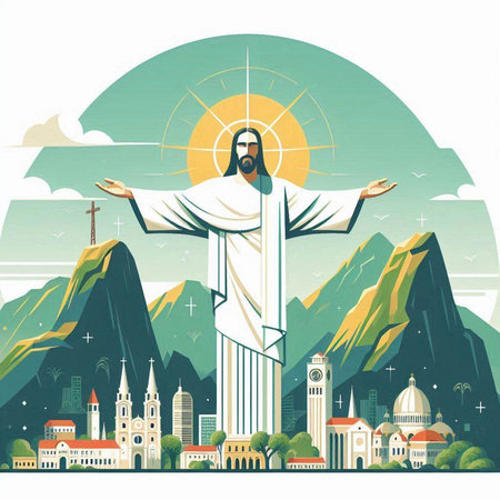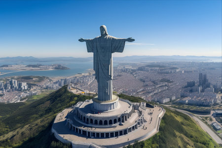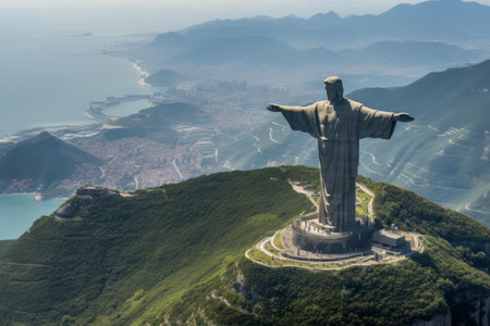 The iconic Christ the Redeemer statue stands tall on Corcovado Mountain, arms outstretched, embracing the breathtaking view of Rio de Janeiro below. This stunning aerial perspective captures the vibrant cityscape, lush greenery, and the dramatic Sugarloaf Mountain in the distance, evoking a sense of awe and reverence.