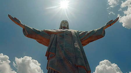 Low angle view of Christ the Redeemer statue with blue sky background, Rio de Janeiro, Brazil.