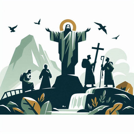 Jesus Christ on the background of the mountains. Vector Illustration.
