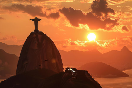 Rio de Janeiro, Brazil - CIRCA 2021: Panorama of Christ the Redeemer (Christ the Redeemer) at sunset with orange sky