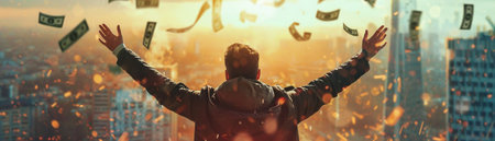 Man reveling in rain of money, city backdrop, sun flare, ecstatic celebration.
