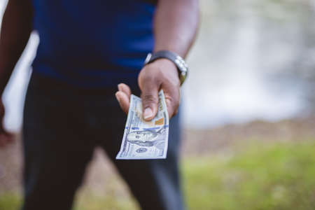 A closeup shot of a person holding a hundred dollar bill with a blurred background - concept bribing