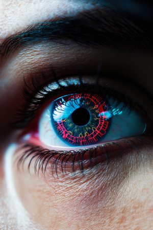 Futuristic human eye technology - digital iris. Close up of a sci-fi cyborg eye