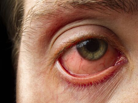 Close up of two annoyed red blood eyes of male affected by conjunctivitis or after flu, cold, allergy. Copy space for advertisement. Tired eyes after working at the computer. Close-up videos and macro