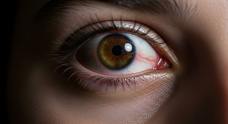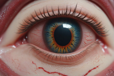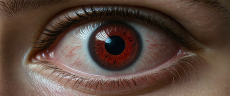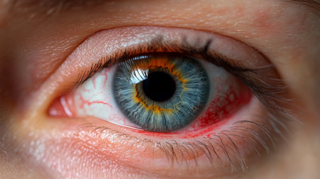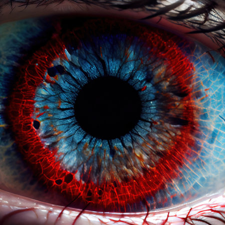 A striking close-up of a human eye, showcasing intricate details of the iris, the richness of colors, and the noticeable redness, illustrating both beauty and health.