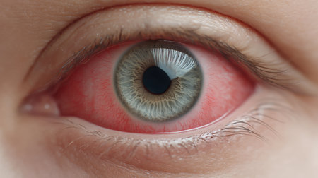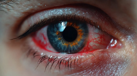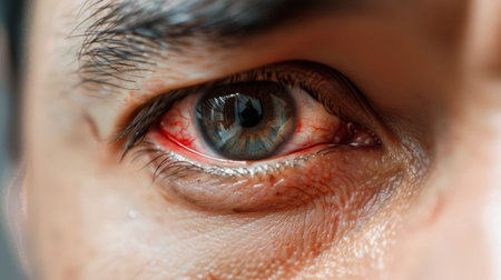 This close-up image showcases the intricate details of a human eye, highlighting redness and irritation. Ideal for health and beauty topics related to allergies or fatigue.